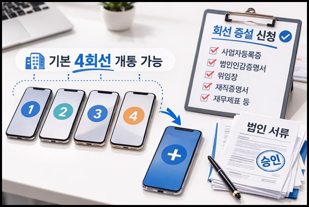 KT의 경우 설립된 지 6개월 이상 된 법인이라면 기본적으로 4회선까지 개통이 가능합니다.
