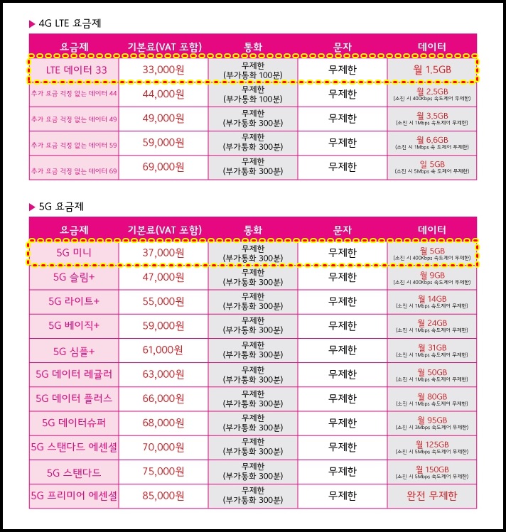 대부분 개인과 동일한 요금제를 이용합니다. 따라서 거의 모든 요금제가 통화는 무제한 제공이 되고 데이터 제공량에 따라 금액이 달라집니다.